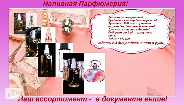 Разливные духи максимально соответствуют известным ароматам. Они расфасованы с учетом требований, предъявляемых к процессу разлива парфюмерной продукции.