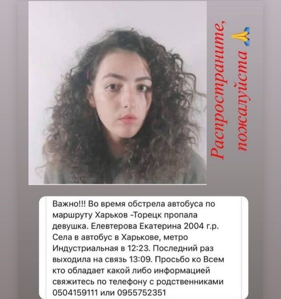 Во время обстрела автобуса по маршруту Харьков - Торецк пропала девушка. Елевтерова Екатерина 2004 г.р.Села в автобус в Харькове, метро Индустриальная в 12:23. Последний раз выходила на связь 13:09.
